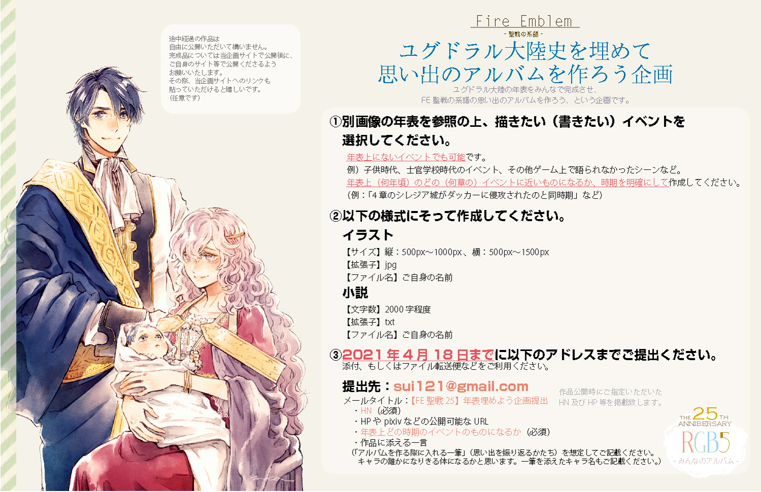 Rgb5 Fe聖戦25周年企画 4 18締切 イラスト 小説の募集 ゲーム内のイベントにそったものでも 隙間 のものでも構いません お気軽にご参加いただければと思います みんなでfe聖戦の思い出のアルバムを作りませんか 作品提出はこちらのから T